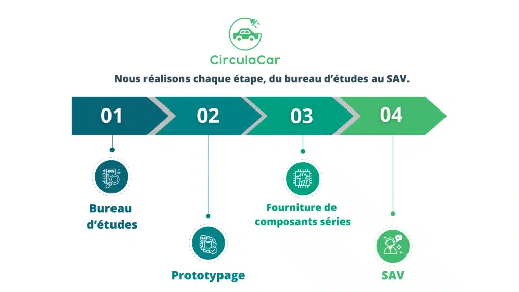 Nous vous accompagnons sur toute la durée de vie de votre projet d’électrification pour être votre seul interlocuteur unique. A partir de vos besoins, nous étudions et nous dimensionnons le kit d’électrification pour réaliser un prototype à installer sur votre véhicule en moins de 12 semaines. Nous vous accompagnons et nous vous formons à l’installation des premiers kits d’électrification dans votre usine. Une fois, la mise en série réalisée de vos véhicules électriques, nous sommes votre interlocuteur unique pour l’après-vente afin de permettre la plus grande réactivité auprès de vos clients.